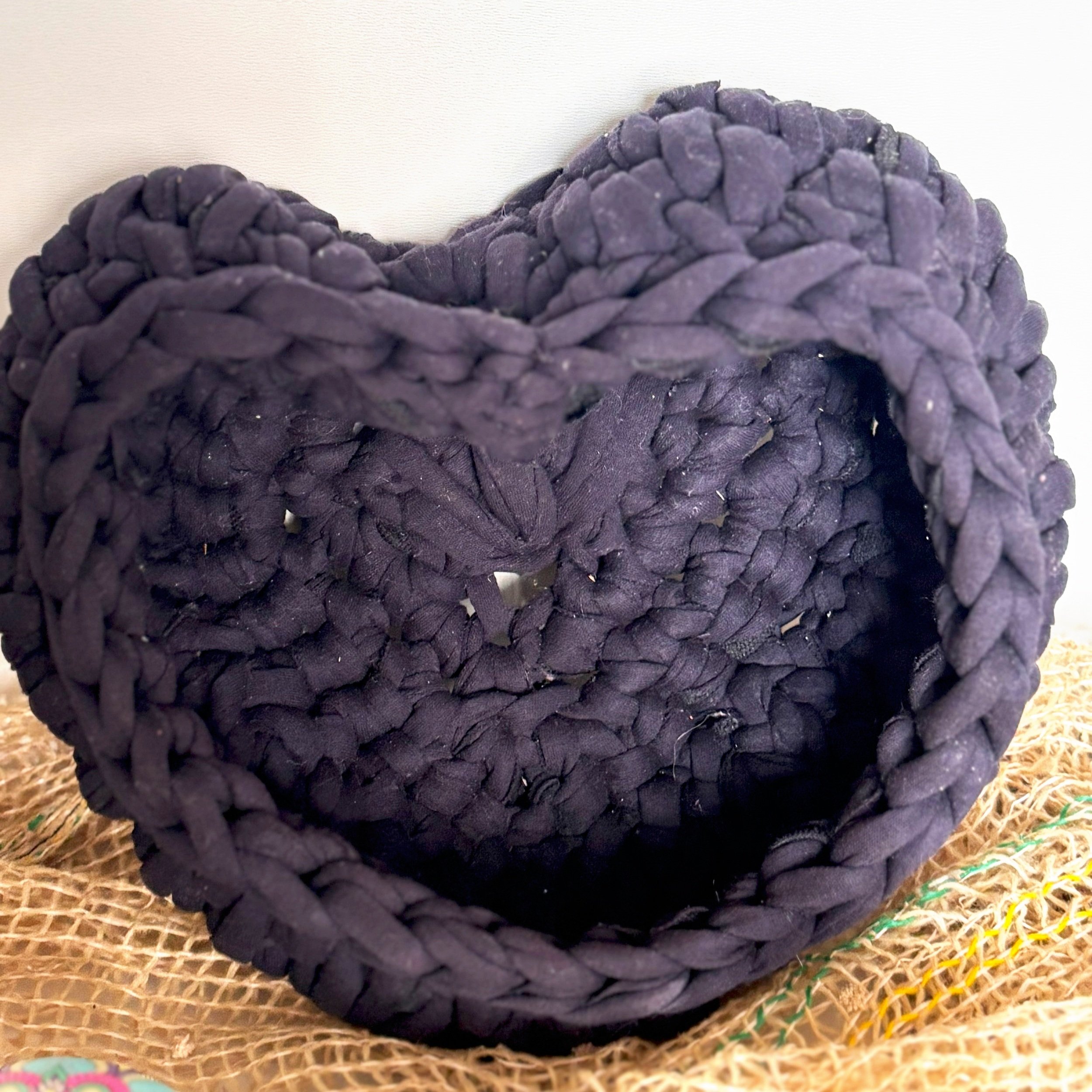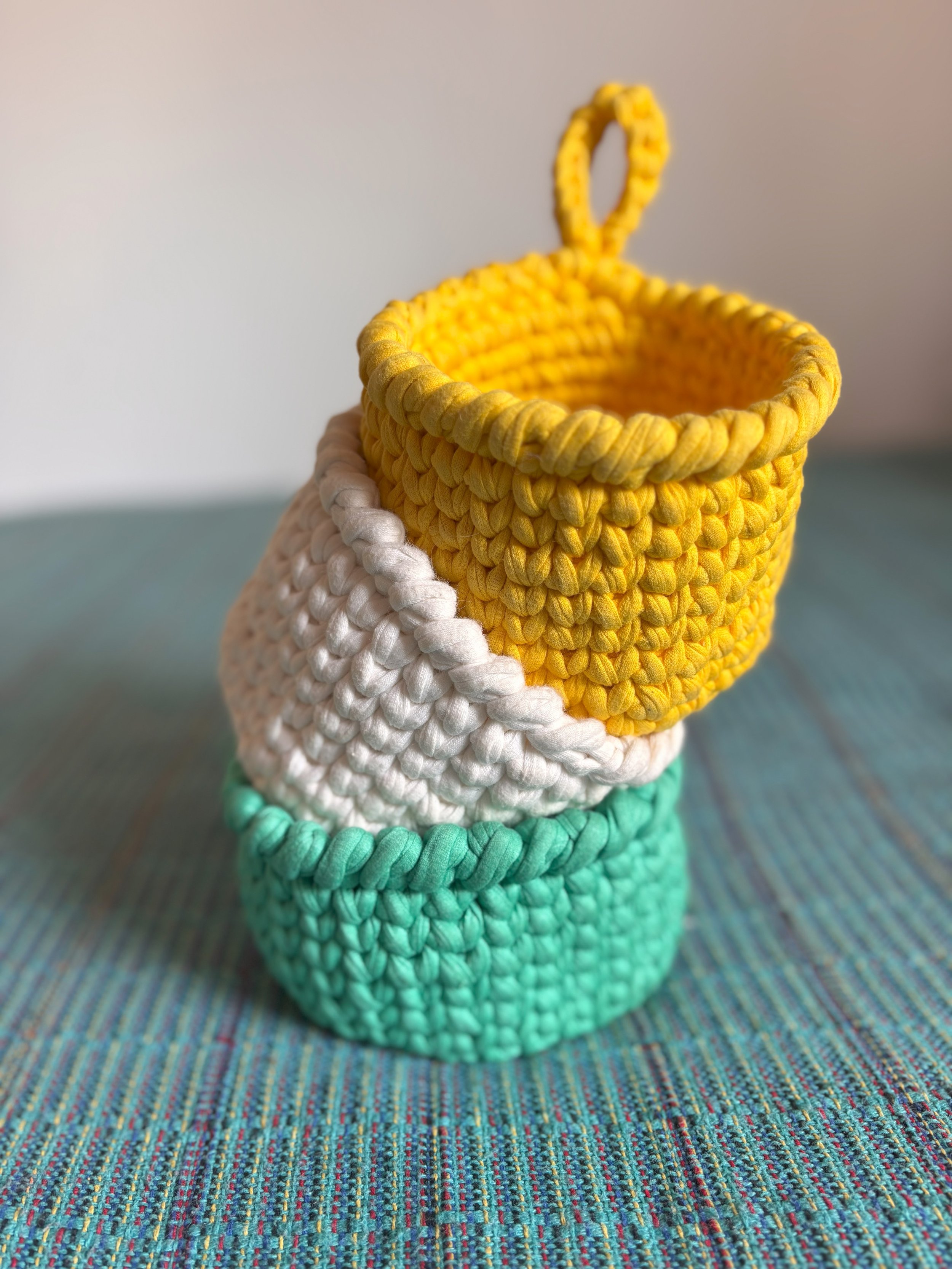 Cesta pequena, feita de fio de malha grosso de tecido reciclado, trançado ou crochetado de forma robusta.